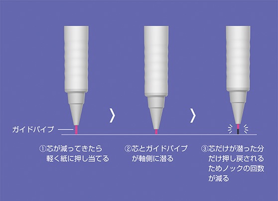 芯が減った際、芯の先端を紙面に軽く押し当てると、芯とガイドパイプが軸側に潜ります。芯は潜った分だけ前方に押し戻されますが、ガイドパイプは潜った位置に留まるため、芯が出た状態になります。この機構により、芯が減る度にノックをしなくても芯を出すことができ、ノックの回数が減り軽快に書き続けることができます。