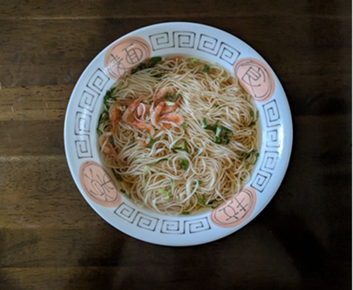 袋の中には国産小麦粉を使用したこだわりの島原手延べそうめん、駿河湾産の桜えび、枕崎産鰹節と北海道産昆布を使ったこだわりの合わせだしが入ってます。作り方はどんぶりに麺と桜エビとネギを入れお湯を注いで3分待って、最後にスープを入れて出来上がりです。