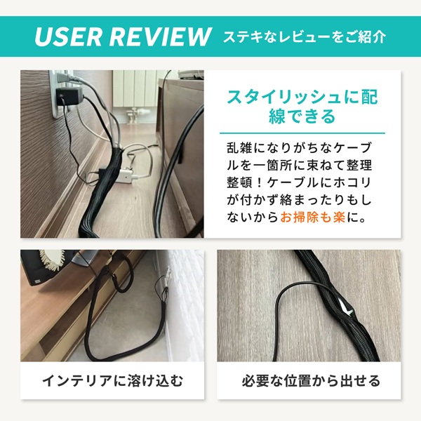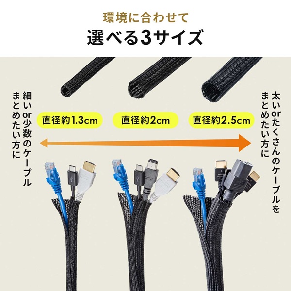 散らばりがちな複数のケーブルを、まとめて包み込む編み込み構造。