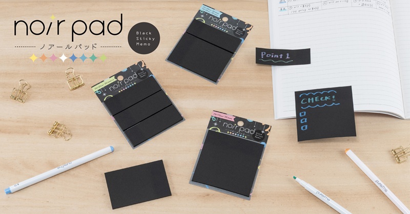 ナカバヤシさんは、黒い用紙にもキレイに発色するラインマーカー「ピュアライン」と黒い付箋「ノアールパッド」を新発売されます。