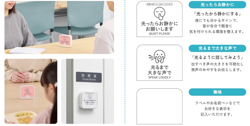 目に見えない声の大きさをライトで可視化。「お静かに」や「大きな声で」を代わりにお伝えします。
